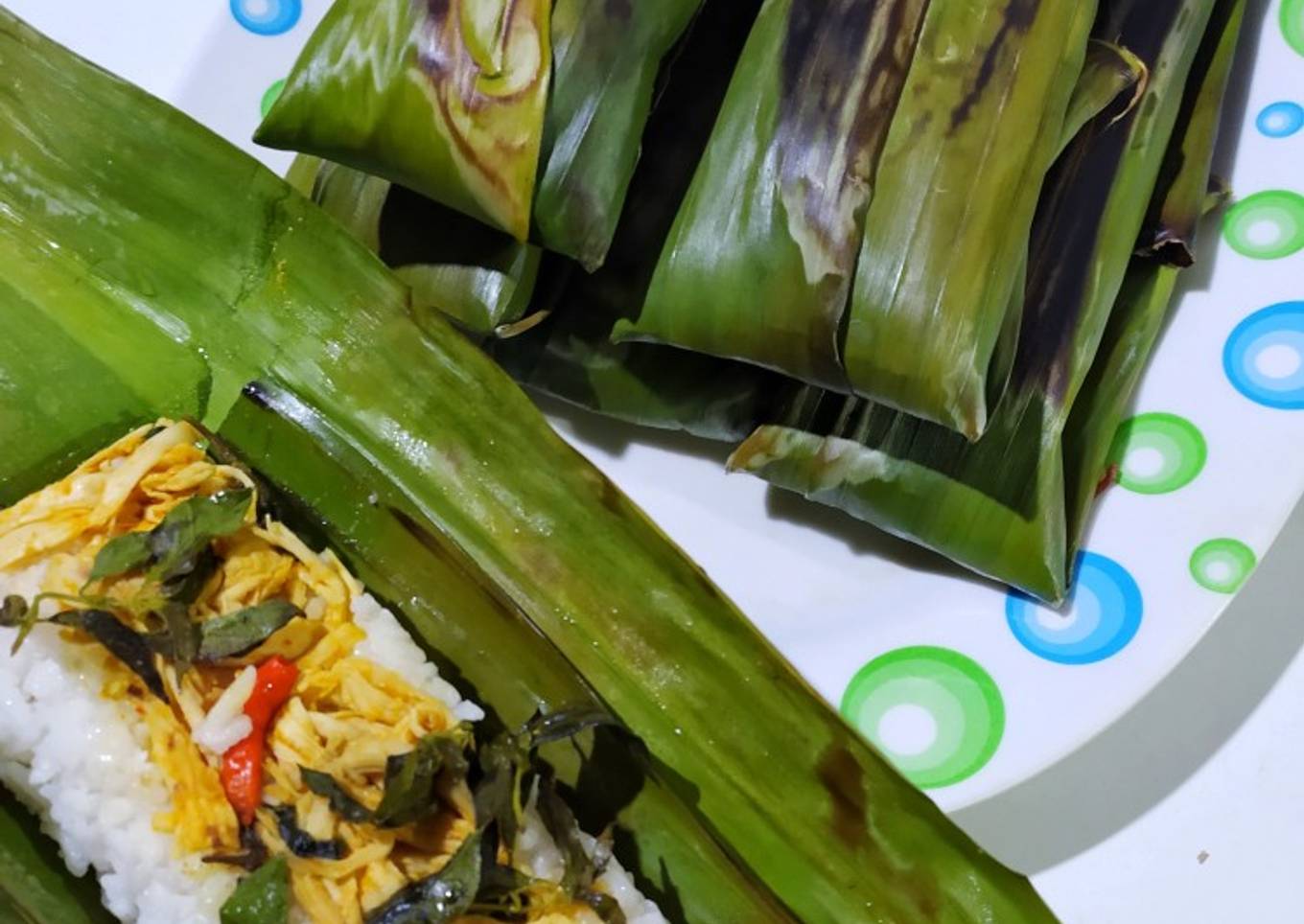 - Ambil daun pisang yang sudah dilayukan diatas api kecil, taruh 2 centong kecil nasi, beri ayam suwir, taburi dengan daun kemangi dan cabe rawit. Lalu bakar diatas teflon hingga kecoklatan.