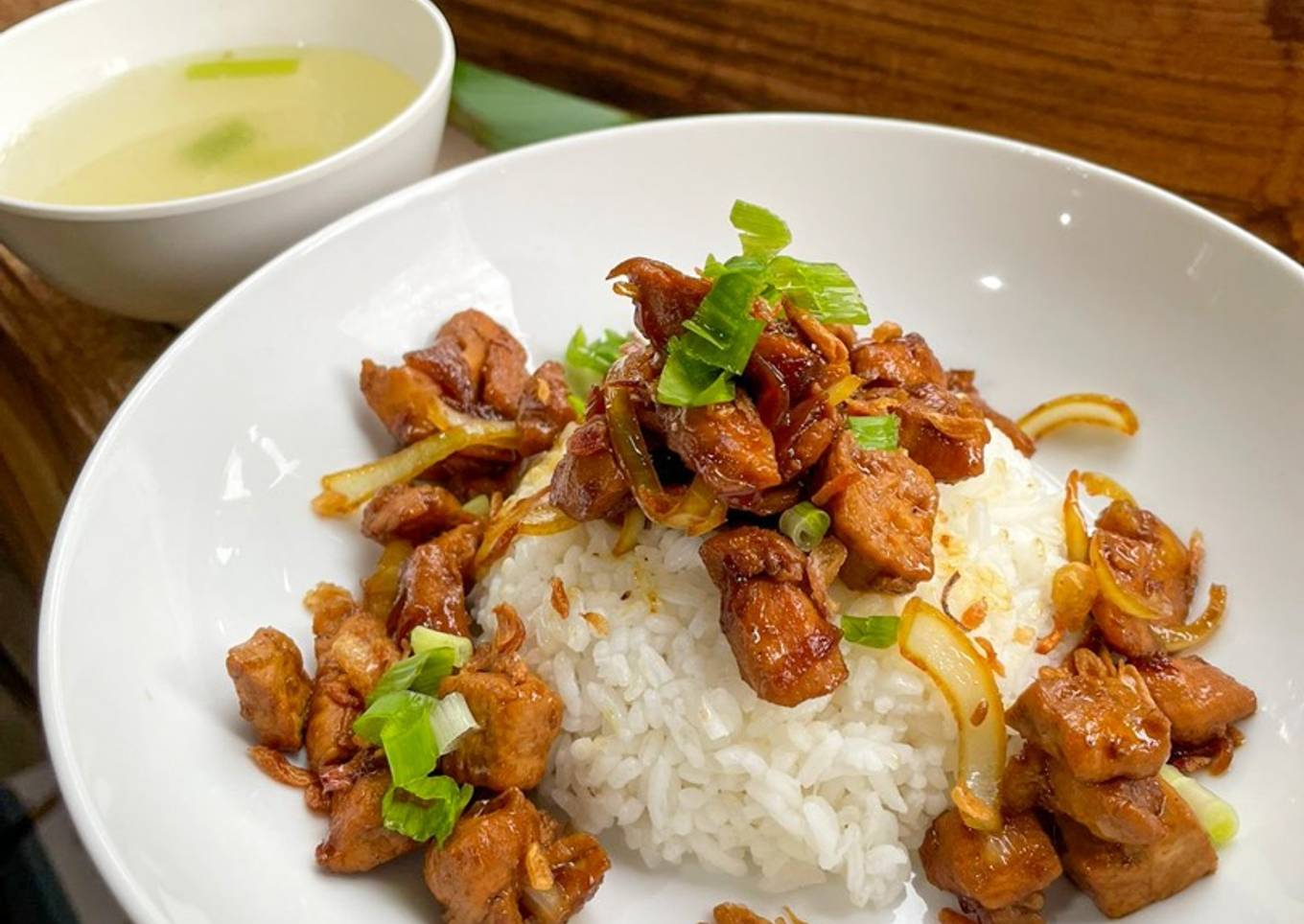 - Susun diatas piring, nasi + lauk ayam. Taburi dengan bawang merah goreng dan irisan daun bawang